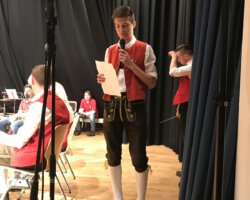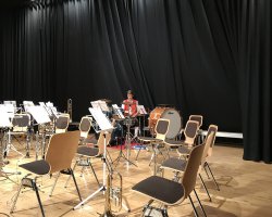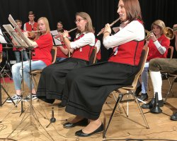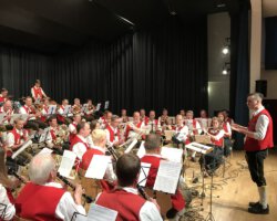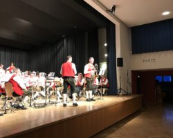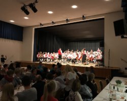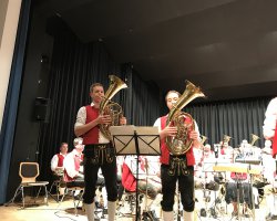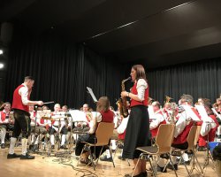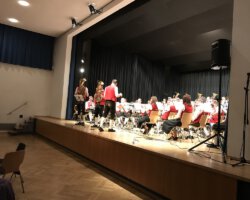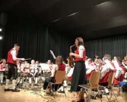 Nach kurzem Umbau kamen dann „die Alten“ auf die Bühne. Maximiliam Lötterle hatte ein sehr abwechslungsreiches – sehr traditionelles, böhmisch – mährisches Programm zusammen gestellt. Neben Klassikern wie Böhmischer Traum, Deutschmeister Regimentsmarsch oder Vogelwiese gab es auch neue Arrangements wie Böhmische Liebe, Slowakischer Traum oder Egerländer Musikantenmarsch zu hören. Als Solisten stellten sich Michael Herdter an der Posaune (Bayerische Polka), Carolin Henning am Saxophon (Coming Home) und unsere beiden Tenorhornisten Sebastian Kömpf und Sascha Kling (Zwei Supermänner) vor. Bei der Südböhmischen Polka kamen dann Boomwhackers zum Einsatz – bei einer Polka eher ungewöhnlich.